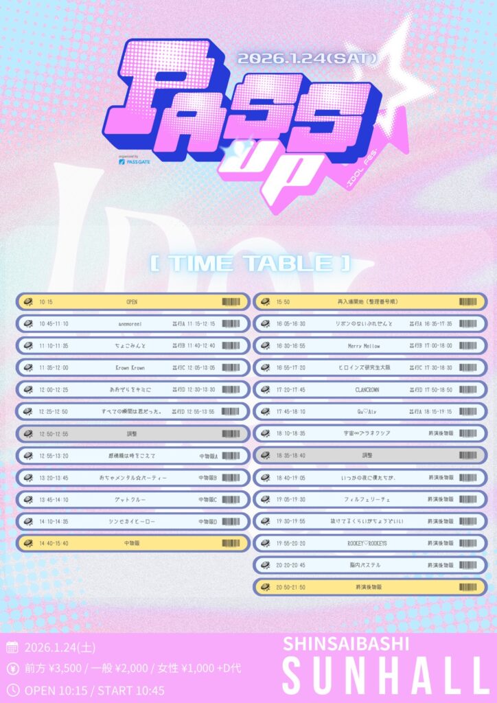 1/24(土)心斎橋SUNHALL〚PASS UP〛